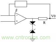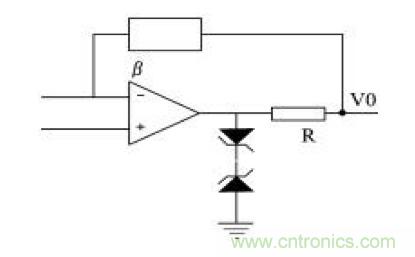 (3)輸出保護。當集成運放過載或輸出端短路時,若沒有保護電路,該運放就會損壞。但有些集成運放內部設置了限流保護或短路保護,使用這些器件就不需再加輸出保護。對于內部沒有限流或短路保護的集成運放,可以采用下圖所示的輸出保護電路。在下圖電路中,當輸出保護時,由電阻R起限流保護作用。