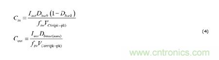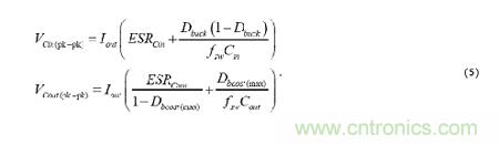 在圖4中,步驟4和5是指分別由降壓和升壓工作模式設(shè)定的輸入和輸出電容值。高密度設(shè)計越來越多地將數(shù)個X5R-或X7R-介質(zhì)陶瓷元件組合在一起,有時還附帶著一個小尺寸電解電容器來實現(xiàn)大批量儲能功能。方程式4使用針對峰值到峰值的紋波電壓,在假定沒有等效串聯(lián)電阻 (ESR) 紋波分量的情況下設(shè)定基線電容估計值。