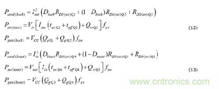方程式12和13分別計算降壓和升壓模式下的傳導、開關(guān)和柵極驅(qū)動損耗。針對降壓-升壓模式的相應表達式是方程式12和13的權(quán)重組合,其依據(jù)是降壓-升壓窗口中的運行點,并且將頻率除以2。