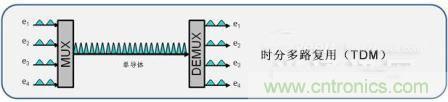 時分復用是一種通過使用越來越小的時間增量來傳輸更多的數(shù)據(jù)的方式,并且將較低數(shù)據(jù)率的信號復用進較高速度的復合信號中。通過時分復用,較低速度的電信號交錯在時間中,并在較快的復合光路上傳輸。因此,所得的較高數(shù)據(jù)速率將是單個輸入速率的數(shù)倍。
