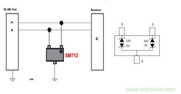 對RS485接口的特點是收發(fā)電平的不對稱,為7V 和12V,所以需要專門設計不對稱的保護芯片,而SM712 SOT-23封裝,專為保護具有非對稱工作電壓(-7V至12V)的RS-485應用而設計,使其免受靜電放電(ESD)、電氣快速瞬變(EFT)和雷電引致的浪涌電流帶來的危害。 它能吸收高于IEC 61000-4-2國際標準規(guī)定之最高級別的反復性ESD放電 30KV,無需擔心其性能發(fā)生減退,并可在極低的箝位電壓下安全地耗散19A的8/20μs波形浪涌電流(IEC61000-4-5)。
