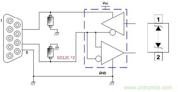 RS232接口一般為內部配置接口,或短距離低速通信口,但此接口經常插拔,需要采用功率300W以上產品進行靜電和浪涌保護,所以需采用SOD-323封裝的SD12C或SD15C(根據客戶芯片的工作電壓波動不同)來保護收發(fā)2路信號。