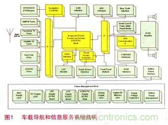 【導(dǎo)讀】在車(chē)載電子系統(tǒng)中,信息娛樂(lè)(Infotainment)系統(tǒng)是發(fā)展最為迅速的部分,它主要可分為三大類(lèi):音頻(CD)、視頻(DVD)以及導(dǎo)航和遠(yuǎn)程信息服務(wù)。最新的進(jìn)展已經(jīng)可以將USB、MP3、藍(lán)牙、iPod和杜比帶入車(chē)內(nèi)。圖1為新的車(chē)載導(dǎo)航娛樂(lè)和信息服務(wù)系統(tǒng)的結(jié)構(gòu)圖。
