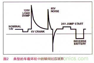 車(chē)載環(huán)境中電源電路中的瞬間過(guò)壓包括:負(fù)載突降(Load Dump)、跳變開(kāi)始(Jump Start)以及各種各樣的電壓噪聲。如圖2所示。其中拋負(fù)載過(guò)壓是車(chē)載環(huán)境中最嚴(yán)重的瞬間過(guò)壓,在12V車(chē)載系統(tǒng)中,其瞬間過(guò)壓可達(dá)125V。
