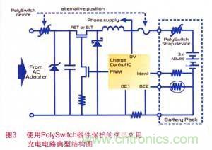 由于PolySwitch器件快速而有效地將過(guò)電流限制到安全水平,且體型小巧,可直接貼裝到電路板,因此,可使用該器件對(duì)PND內(nèi)的每條電源電路進(jìn)行一對(duì)一的保護(hù)。圖3為使用了PolySwitch電路保護(hù)器件的便攜式電子設(shè)備中的電池充電電路典型結(jié)構(gòu)圖。PolySwitch和鉗位二極管共同保護(hù)設(shè)備不受過(guò)電壓、極性反轉(zhuǎn)等故障的損害,保護(hù)汽車(chē)電源及電路不因便攜式電子設(shè)備內(nèi)部故障而損壞。