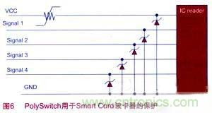 接觸式Smart Card內(nèi)部有一個(gè)IC芯片,用于傳輸信息、存儲(chǔ)數(shù)據(jù)等。Smart Card工作時(shí),由讀卡器的Vcc電壓供電。損壞的Smart Card或者其他導(dǎo)電物品被錯(cuò)誤地放進(jìn)讀卡器,都有可能造成讀卡器電路出現(xiàn)短路,而造成永久損壞。在讀卡器電路中使用PolySwitch可恢復(fù)器件能夠?qū)Υ祟?lèi)電路故障進(jìn)行保護(hù)。如圖6,在讀卡器的Vcc供電電路中串聯(lián)PolySwitch器件,當(dāng)出現(xiàn)短路過(guò)電流故障時(shí),PolySwitch器件能夠切斷電路,在故障排除后恢復(fù)電路,并在所有端口進(jìn)行ESD防護(hù)。