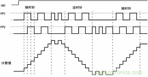 方向盤(pán)轉(zhuǎn)角傳感器的輸出為正交編碼脈沖。正交編碼脈沖包含兩個(gè)脈沖序列,有變化的頻率和四分之一周期(90°)的固定相位偏移,如圖1所示。通過(guò)檢測(cè)2路信號(hào)的相位關(guān)系可以判斷為順時(shí)針?lè)较蚝湍鏁r(shí)針?lè)较?,并?jù)此對(duì)信號(hào)進(jìn)行加/減計(jì)數(shù),從而得到當(dāng)前的計(jì)數(shù)累計(jì)值,也即方向盤(pán)的絕對(duì)轉(zhuǎn)角,而轉(zhuǎn)角的變化率即角速度,則可通過(guò)信號(hào)頻率測(cè)出。另外,方向盤(pán)轉(zhuǎn)角傳感器有一個(gè)零位輸出信號(hào),當(dāng)方向盤(pán)在中間位置時(shí),該信號(hào)輸出0V,否則輸出5V,通過(guò)該信號(hào),可對(duì)絕對(duì)轉(zhuǎn)角進(jìn)行在線校準(zhǔn)。