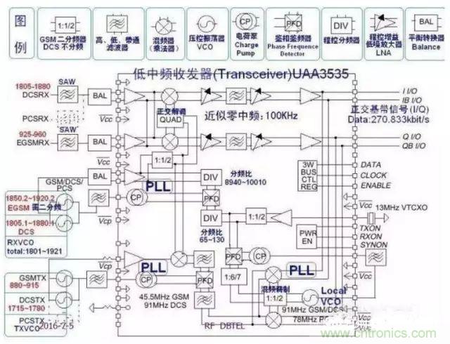 1.收發(fā)器(Transceiver)收發(fā)器即調(diào)制解調(diào)器調(diào)制:發(fā)射時(shí)基帶信號(hào)加載到射頻信號(hào)解調(diào):接收時(shí)射頻信號(hào)過濾出基帶信Transceiver根據(jù)其工作頻率可分為:單頻、雙頻、三頻等Transceiver根據(jù)其中頻特征可分為有中頻、零中頻、近零中頻等以DB2009為例介紹Transceiver UAA3535的內(nèi)部結(jié)構(gòu)UAA3535是近零中頻收發(fā)器,它最多可以作三頻收發(fā)它內(nèi)部有:三個(gè)PLL(包括一個(gè)內(nèi)置VCO)、正交混頻解調(diào)器、可控增益低噪放大器、混頻調(diào)制器等它需外接:13MHz參考基準(zhǔn)時(shí)鐘、RXVCO、TXVCO、基帶控制信號(hào)等我們需要研究其內(nèi)部各重要節(jié)點(diǎn)的頻率、帶寬,信號(hào)轉(zhuǎn)換的流程等細(xì)節(jié)