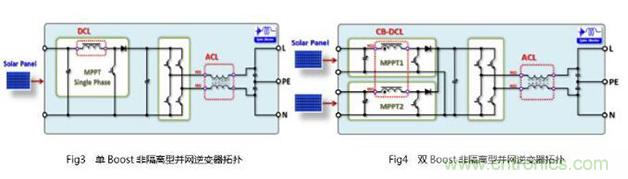 3)對于一些復雜系統(tǒng),特別是像日本市場的產品,為適合其國情,往往在PV逆變器的前端會采用多個MPPT的直流升壓,而后端卻只有單Boost進行MPPT控制。