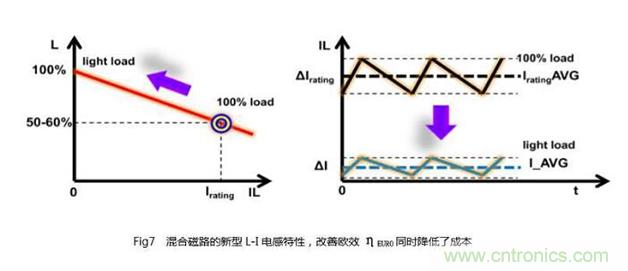 從中可知,要顯著提高其綜合效率,就必須最大限度地控制好較輕負荷時的功率損耗。利用混合磁路中不同磁材的特性,通過對其磁路長度、磁阻及繞線匝數(shù)等影響電感特性的諸要素進行優(yōu)化調節(jié),使之符合圖7所示的L-I直流電感偏置特性,從而可實現(xiàn)歐效改善與低成本設計的兼顧。