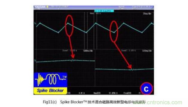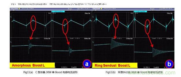 圖11(a)為目前廣為采用的C型非晶材料繞制的3 kW單Boost電感的額定功率時的典型工作電流波形。在Boost開通和關斷時,電感電流出現(xiàn)了比較嚴重的高頻振蕩,其振蕩頻率成分也比較豐富,約在20~30 MHz寬帶上;Fig11(b)為采用數(shù)只φ47的鐵硅鋁磁環(huán)繞制的3 kW單Boost電感的波形,同樣圖中顯示出10 MHz左右的高頻衰減振蕩;Fig11(C)則為采用了優(yōu)化結構和相關設計工藝規(guī)范的Spike Blocker TM技術后,使用Hybrid Magnetics混合磁路設計的新型高效能電感的實測波形(這些測試均基于相同設備、相同輸入輸出電壓、功率、工作頻率條件),由此可見,關注電感的EMC設計工藝規(guī)范具有十分重要的意義。