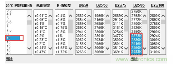 圖2,Digi-Key網(wǎng)站NTC參數(shù)比較與篩選