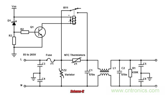繼電器初始是斷開的。當Vaa逐漸達到自身電壓的時候,齊納二極管D1導(dǎo)通,三極管Q1打開,繼電器RY1閉合,相當于把限流NTC熱敏電阻Z1短路。