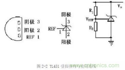 TL431是由德州儀器生產(chǎn)的可控精密穩(wěn)壓源,實(shí)物如圖2-3所示。它的輸出電壓用兩個(gè)電阻就可以任意的設(shè)置到從2.5V到36V范圍內(nèi)的任何值。該器件的典型動(dòng)態(tài)阻抗為0.2Ω,在很多應(yīng)用中用它代替穩(wěn)壓二極管,例如,數(shù)字電壓表,運(yùn)放電路,可調(diào)壓電源,開(kāi)關(guān)電源等。圖2-2所示為T(mén)L431引腳排列與使用連線圖。