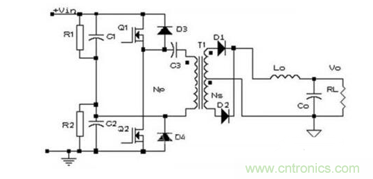 電容器C1和C2與開關(guān)管Q1、Q2組成橋,橋的對(duì)角線接變壓器T1的原邊繞組,故稱半橋變換器。如果此時(shí)C1=C2,那么當(dāng)某一開關(guān)管導(dǎo)通時(shí),繞組上的電壓只有電源電壓的一半。