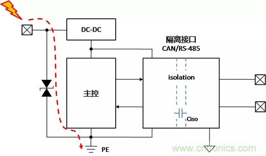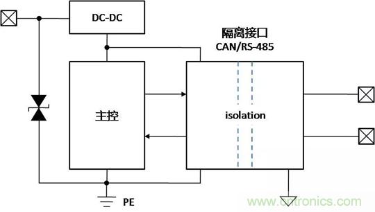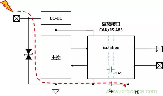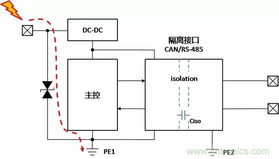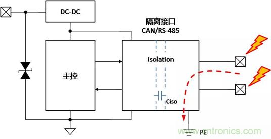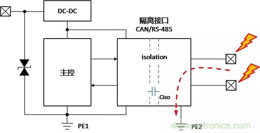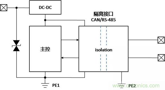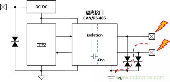 帶隔離通信接口的設(shè)備,在不同的使用、安裝狀態(tài)下,接口會表現(xiàn)出完全不同的ESD特性,了解設(shè)備在不同的使用狀態(tài)下,ESD對接口的影響的機(jī)理,才能有針對性地增加保護(hù)器件,提升隔離接口的ESD能力。下面以帶有隔離CAN或RS-485通信接口為例,對常見的設(shè)備狀態(tài)下,ESD的作用機(jī)理進(jìn)行分析,并提出相應(yīng)的改善措施。