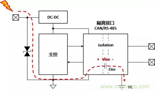 當(dāng)總線側(cè)接口受到靜電放電時(shí),靜電能量通過隔離接口模塊內(nèi)部總線側(cè)器件泄放至PE,如圖 7。若ESD能量超出了接口模塊內(nèi)部總線側(cè)器件的ESD抗擾能力,總線接口則可能損壞。