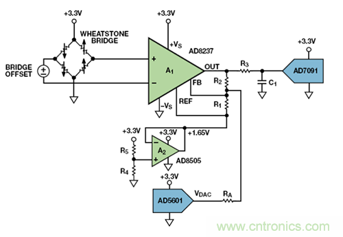 這個問題可通過圖 5 所示的電路來解決。電橋放大器A1是一個像AD8237 一樣的ICF儀表放大器。放大器A2,帶R4 和R5,將A1的零電平輸出設為中間電源。AD5601 8 位DAC對輸出進行調整,通過RA使電橋失調為 0。然后,放大器的輸出由AD7091微功耗 12 位ADC數(shù)字化。