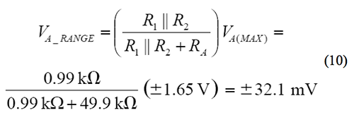 由于 DAC 可以擺動±1.65 V,因此,總失調調整范圍可通過由 RA以及 R1和 R2的并聯(lián)組合形成的分壓器給定,其計算方法如下: