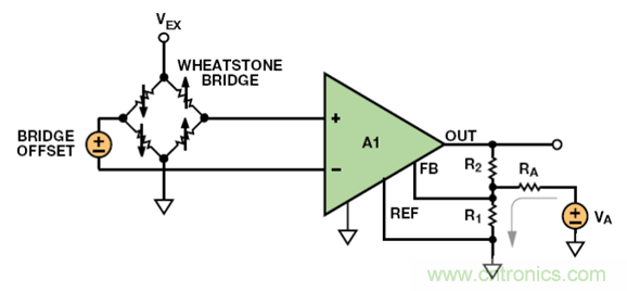 例如,在各元件的容差均為 0.1%且激勵電壓為 5 V 時,差分失調可以高達±5 mV。如果需要 400 的增益來實現(xiàn)所需電橋靈敏度,則放大器輸出端的失調變成±2 V。假設放大器由同一電源驅動,并且其輸出可以軌到軌擺動,則僅電橋失調就可能消耗掉 80%以上的輸出擺幅。在行業(yè)要求電源電壓越來越小的趨勢下,這個問題只會變得更加糟糕。