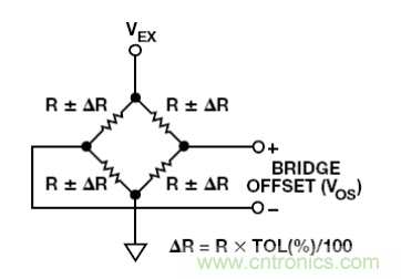 惠斯登電橋是這種情況的經典例子,但像生物傳感器一類的原電池具有類似的特性。電橋輸出信號為差分信號,因此,儀表放大器是高精度測量的首選。理想情況下,無負載電橋輸出為零,但僅當所有四個電阻均完全相同時,這種情況方為真。假如有一個以分立式電阻構建的電橋,如圖 1 所示。最差情況差分失調 VOS 為: