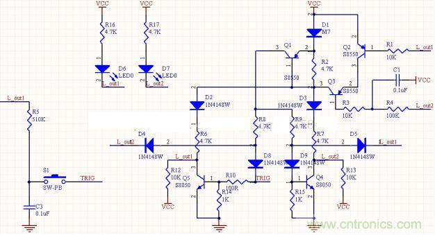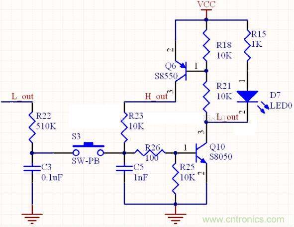 利用Q10的輸出與輸入狀態(tài)相反(非門)特性和電容的電流積累特性。剛上電時Q6和Q10的發(fā)射結(jié)均被10K電阻短路所以Q6和Q10均截止,此時實測電路耗電流僅為0.1uA,L_out輸出高,H_out輸出低。此時C3通過R22緩慢充電最終等于VCC電壓,當按下S3后C3通過R26給Q10基極放電,Q10迅速飽和,Q6也因此飽和,H_out變?yōu)楦唠娖?,當C3放電到Q10be結(jié)壓降0.7V左右時C3不再放電,此時若按鍵彈開C3將進一步放電到Q10的飽和壓降0.3V左右,當再次按下S3,Q10即截止。