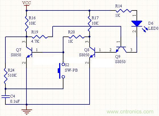 這個電路可以完美解決按鍵抖動和長按按鍵跳檔的問題,開關(guān)狀態(tài)翻轉(zhuǎn)只發(fā)生在按鍵接觸的瞬間,之后即便按鍵存在抖動或長按按鍵的情況開關(guān)狀態(tài)不會受到影響。這是因為R22的電阻很大(相對R23,R26,R25)當C3電容的電壓穩(wěn)定后,R22遠不足以改變Q10的開關(guān)狀態(tài),R22要能改變Q10的狀態(tài)必須要等S3彈開后C3將流過R22的小電流累積存儲,之后再通過S3的瞬間接觸快速大電流釋放從而改變Q10的狀態(tài)。