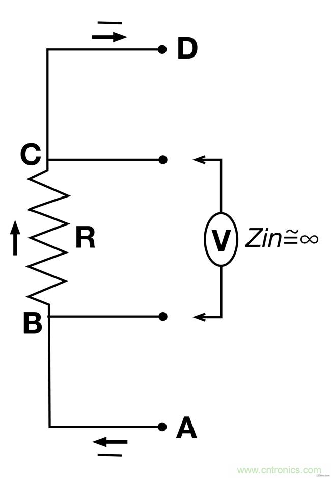 原則上借助電阻(“R”)和相應(yīng)的壓降(“V”,從B到C)來測(cè)量電流(I,從A到D)是非常簡單的,但是有一些細(xì)小的問題要承認(rèn),當(dāng)電流很高而且電阻阻值為100 mΩ或者更低時(shí)我們要采用四線高阻抗開爾文感應(yīng)檢測(cè)法則。