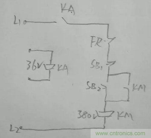 下面我畫了一個(gè)簡單的36v電源控制線圈電源為380v的接觸器的控制線路,供大家參考,也請大家多多指教。