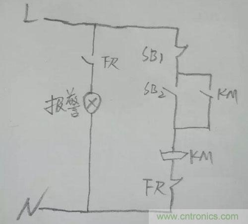 簡單描述一下這個(gè)圖。當(dāng)電動(dòng)機(jī)工作正常的時(shí)候,熱繼電器的常閉觸點(diǎn)接通,常開觸點(diǎn)斷開,報(bào)警裝置不工作。如果電機(jī)出現(xiàn)故障,熱繼電器內(nèi)部的熱元件把常閉點(diǎn)斷開的同時(shí),熱繼電器的常開點(diǎn)閉合,報(bào)警裝置形成回路,報(bào)警響起,提醒操作人員及時(shí)檢修。