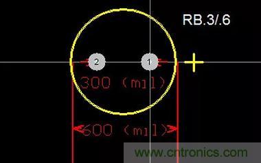 電解電容封裝則以RB標(biāo)識(shí),常見封裝有:RB.2/.4、RB.3/.6、RB.4/.8、RB.5/1.0,符號(hào)中前面數(shù)字表示焊盤中心孔間距,后面數(shù)字表示外圍尺寸(絲?。瑔挝蝗匀皇怯⒋?,如下圖(RB-.3/.6):