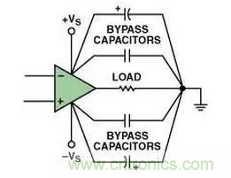 電源端接地:這種方法在大多數(shù)情況下都是最有效的,采用多個并聯(lián)電容器將運算放大器的電源引腳直接接地。一般說來兩個并聯(lián)電容就足夠了——但是增加并聯(lián)電容器可能給某些電路帶來益處。