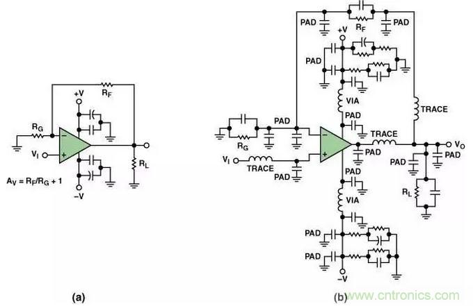 所謂寄生效應(yīng)就是那些溜進你的PCB并在電路中大施破壞、頭痛令人、原因不明的小故障(按照字面意思)。它們就是滲入高速電路中隱藏的寄生電容和寄生電感。其中包括由封裝引腳和印制線過長形成的寄生電感;焊盤到地、焊盤到電源平面和焊盤到印制線之間形成的寄生電容;通孔之間的相互影響,以及許多其它可能的寄生效應(yīng)。圖3(a)示出了一個典型的同相運算放大器原理圖。但是,如果考慮寄生效應(yīng)的話,同樣的電路可能會變成圖3(b)那樣。