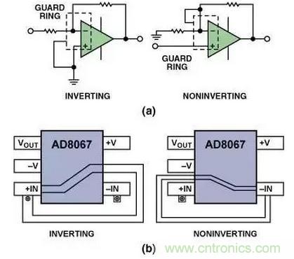 圖15(a)示出了用于運算放大器反相配置和同相配置中的保護環(huán)的原理圖。圖15(b)示出用于SOT-23-5封裝中兩種保護環(huán)的典型布線方法。