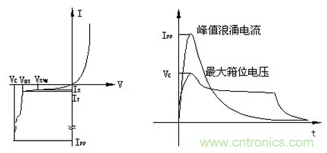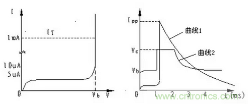 如果用圖示儀觀察TVS的特性,就可得到圖1中左圖所示的波形。如果單就這個(gè)曲線來看,TVS管和普通穩(wěn)壓管的擊穿特性沒有什么區(qū)別,為典型的PN結(jié)雪崩器件。