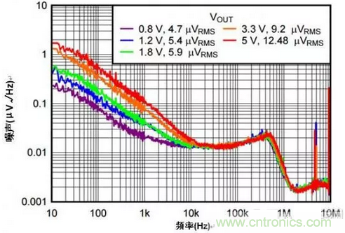 如您從各種曲線看到的那樣,輸出噪聲(以每平方根赫茲[μV/ Hz]來表示)集中在頻譜低端。該噪聲大部分出自內(nèi)部參考電壓,以及誤差放大器FET和電阻分壓器。