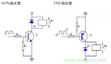 NPN晶體管驅動時:當晶體管T1基極被輸入高電平時,晶體管飽和導通,集電極變?yōu)榈碗娖剑虼死^電器線圈通電,觸點RL1吸合。