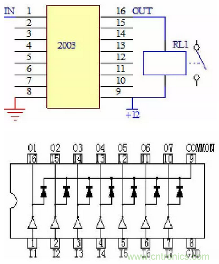 根據(jù)集成電路驅動器2003的輸入輸出特性,有人把它簡稱叫“驅動器”“反向器”“放大器”等,現(xiàn)在常用型號為:TD62003AP。當2003輸入端為高電平時,對應的輸出口輸出低電平,繼電器線圈通電,繼電器觸點吸合;當2003輸入端為低電平時,繼電器線圈斷電,繼電器觸點斷開;在2003內部已集成起反向續(xù)流作用的二極管,因此可直接用它驅動繼電器。
