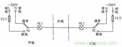 在某些生產(chǎn)過程中,需要兩地的生產(chǎn)人員能傳遞簡單的信息,以協(xié)調(diào)工作。圖22所示是用一根導(dǎo)線傳遞聯(lián)絡(luò)信號線路。兩地中各有一只雙擲開關(guān)控制信號燈聯(lián)絡(luò),信號燈分別裝在兩地,一地一個。當(dāng)甲地向乙地發(fā)聯(lián)絡(luò)信號時,撥動開關(guān)S1,乙地的指示燈亮,待乙地完成甲地所指示的任務(wù)后,乙地可把開關(guān)撥至“聯(lián)絡(luò)”位置,通知甲地工作已完成。