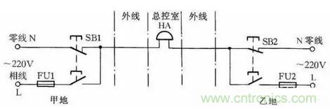 圖23所示線路可使甲乙兩地都能向總控制室發(fā)聯(lián)絡(luò)信號。當(dāng)甲地向總控制室發(fā)信號時,按下按鈕SB1,控制室的電鈴告警。同理當(dāng)乙地向總控制室發(fā)信號時按下SB2即可。甲乙兩地信號可用信號鈴聲的時間長短或次數(shù)區(qū)分。