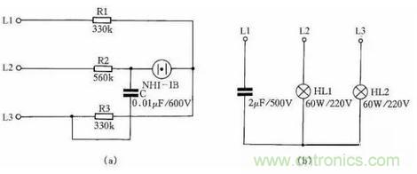 第二種方法是:用一只2μF、耐壓為500V的電容和兩只相同功率(220V/60W)的白熾燈泡,便可做成一個交流電源相序指示器,見圖25(b)。