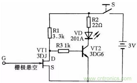 圖28所示是一感應(yīng)測電筆線路。它可方便地測出導(dǎo)線的斷芯位置。在用來測導(dǎo)線斷芯位置時,在導(dǎo)線一端接上220V的電源相線,然后用感應(yīng)測電筆的探頭柵極靠近被測導(dǎo)線,并沿線移動。如果發(fā)光二極管在移動中突然熄滅,那么此處便是導(dǎo)線斷芯位置。