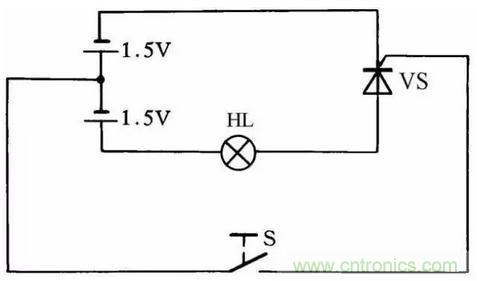 利用圖30所示的簡便方法可檢查晶閘管的好壞。當(dāng)開關(guān)S斷開時燈泡不亮,而當(dāng)開關(guān)S閉合后燈泡發(fā)亮,說明晶閘管能導(dǎo)通工作,否則晶閘管就是壞的。此方法對一般晶閘管均能測試,燈泡選用1.5V小電珠燈泡。