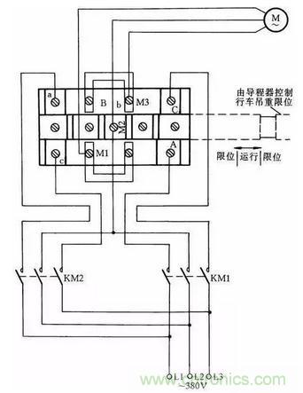 這里介紹一種常用限位器接線方法,這種限位器主要用于行車的上下電動機限位。當(dāng)?shù)蹉^高于限制位置時,它會使電動機自動斷開電源。這種方法一般是斷開主電機電源線,而不是用控制線控制接觸器通斷電動機停止限位,其優(yōu)點是萬一接觸器觸點熔在一起不能斷開時,限位器同樣能起到保護限位的作用。其接線方法如圖38所示。