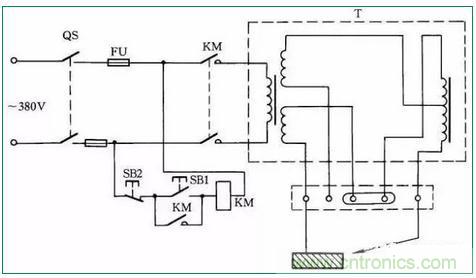 交流電焊機一般接法如圖39所示。當(dāng)合上刀閘QS時,按下按鈕SB1,接觸器KM得電吸合;松開按鈕SB1時,KM自鎖觸點自鎖,電焊機繼續(xù)得電工作。當(dāng)按下SB2時,電焊機停止工作。
