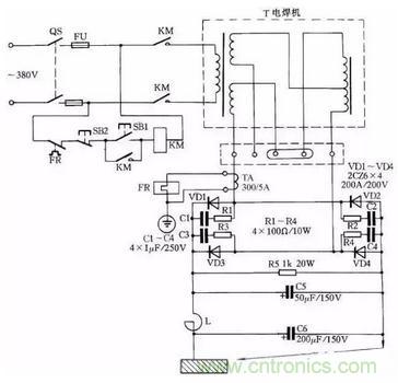 電路中VD1~VD4為4只硅整流二極管;R1~R4、C1~C4組成硅整流器件的過壓保護電路;FR為過流繼電器,保護硅整流器件。當(dāng)負載電流超過額定值時,電流互感器次級電流相應(yīng)增加,帶動繼電器FR動作,F(xiàn)R常閉觸點打開,接觸器KM釋放,觸點打開切斷電焊機電源。硅整流器件用0.25kW風(fēng)扇作風(fēng)冷設(shè)備。圖中,C5為濾波電容,R5為泄放電阻。