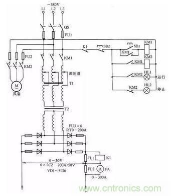 在電鍍過程中,常常利用硅整流器件的調(diào)壓電路進行工作,其工作原理如圖41所示。當(dāng)需進行工作時,按下按鈕SB1,接觸器KM1線圈通電,主回路中觸點閉合,線路輸出直流電壓。與此同時,KM2也得電動作,接通電扇,對硅整流器件以及調(diào)壓器吹冷風(fēng)降溫。線路中KI為過流繼電器。