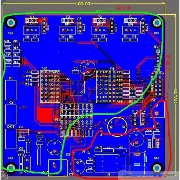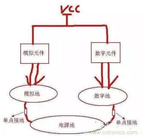 從這個圖可以看出:模擬地和數(shù)字地是完全分開的,最后都單點(diǎn)接到了電源地,這樣可以防止地信號的相互串?dāng)_而影響某些敏感元件,眾所周知數(shù)字元件對干擾的容忍度要強(qiáng)于模擬元件,而數(shù)字地上的噪聲一般比較大所以將它們的地分開就可以降低這種影響了。還有單點(diǎn)接地的位置應(yīng)該盡量靠近板子電源地的入口(起始位置),這樣利用電流總是按最短路徑流回的原理可將干擾降到最小。