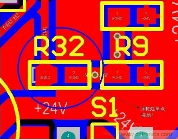 從此圖可以看出:只在電源地和數(shù)字地之間用一個0歐電阻或磁珠之類的單點(diǎn)接地就行了,同樣單點(diǎn)接地的位置應(yīng)該盡量靠近板子電源地的入口(起始位置)。