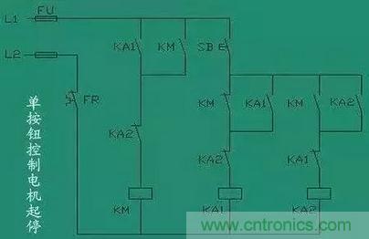 這個電路沒有太大的實用性,但是非常適合學(xué)習(xí)。2個中間繼電器和一個交流接觸器,我們看一下電路,2個繼電器互鎖,KA1的線圈串KM的輔助常閉點,KA2的線圈串KM的輔助常開點。所以按下SB按鈕開關(guān)KA1自鎖,同時KA1的常開點閉合KM自鎖,實現(xiàn)了啟動操作。然后再按下SB按鈕開關(guān),KA2又會自鎖,KA2的常閉點會斷開,而KA2的常閉點是串的KM的線圈,所以同時KM線圈失電,實現(xiàn)停止操作。